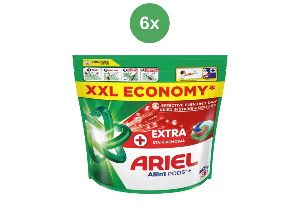 Ariel All-in-1 PODS+ Extra Fleckenentfernung sind hochwirksame Waschmittelkapseln, die selbst hartnäckige Flecken und unangenehme Gerüche perfekt entfernen. Dank fortschrittlicher Technologie beseitigen sie sogar bis zu 7 Tage alten, eingetrockneten Schmutz und sorgen so für strahlend saubere und frische Wäsche.