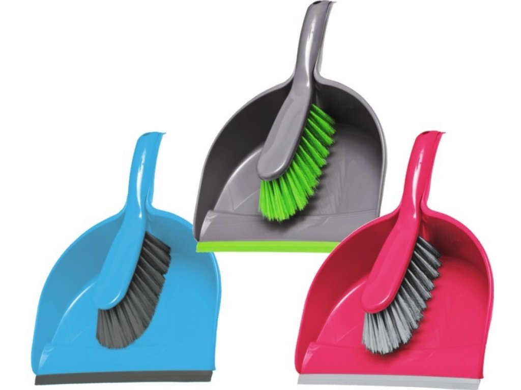 Besenset mit Kehrschaufel. Die Kehrschaufel besteht aus ungeteilter synthetischer PET-Faser, eine Kunststoff-Kehrschaufel mit Gummistreifen.