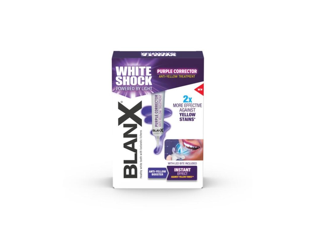 Intensive Aufhellungsbehandlung mit LED-Mundstück und Actilux-Technologie BlanX White Shock Purple Treatment ist eine Intensivbehandlung gegen gelbe Verfärbungen. Das violette Serum neutralisiert Gelbstich sofort, während die patentierte Actilux-Technologie durch LED-Licht aktiviert wird und den ganzen Tag wirkt. Bei regelmäßiger Anwendung zusammen mit BlanX White Shock Purple Paste verstärkt sich der Effekt um bis zu 2x und Ergebnisse sind bereits nach 6 Tagen sichtbar*. Das LED-Mundstück ist einfach zu verwenden, wiederverwendbar und speziell für BlanX-Produkte entwickelt. Eigenschaften: sofortige optische Aufhellung von Gelbstichen** LED-Licht aktiviert und verstärkt die Wirkung von Actilux bis zu 2x höhere Wirksamkeit in Kombination mit White Shock Purple Paste* Ergebnisse nach bereits 6 Tagen regelmäßiger Anwendung* Anwendung: Nach dem Zähneputzen mit BlanX White Shock Purple Paste eine dünne Schicht Serum auf beide Bögen des Mundstücks auftragen, auf die Zähne setzen und das LED-Licht 10 Minuten lang einschalten. Anschließend ausspülen. Verwenden Sie das LED-Mundstück ausschließlich mit BlanX-Produkten. Nur für Erwachsene. Warnhinweis: Vorübergehende Verfärbungen der Schleimhäute sind ein natürlicher Effekt der Zusammensetzung. Enthält: Natriumfluorid 0,32 % (1450 ppm F⁻). *Klinisch-kosmetischer Test: Ergebnis nach 6-tägiger Anwendung in Kombination mit BlanX® Paste. **Vorübergehender optischer Effekt.