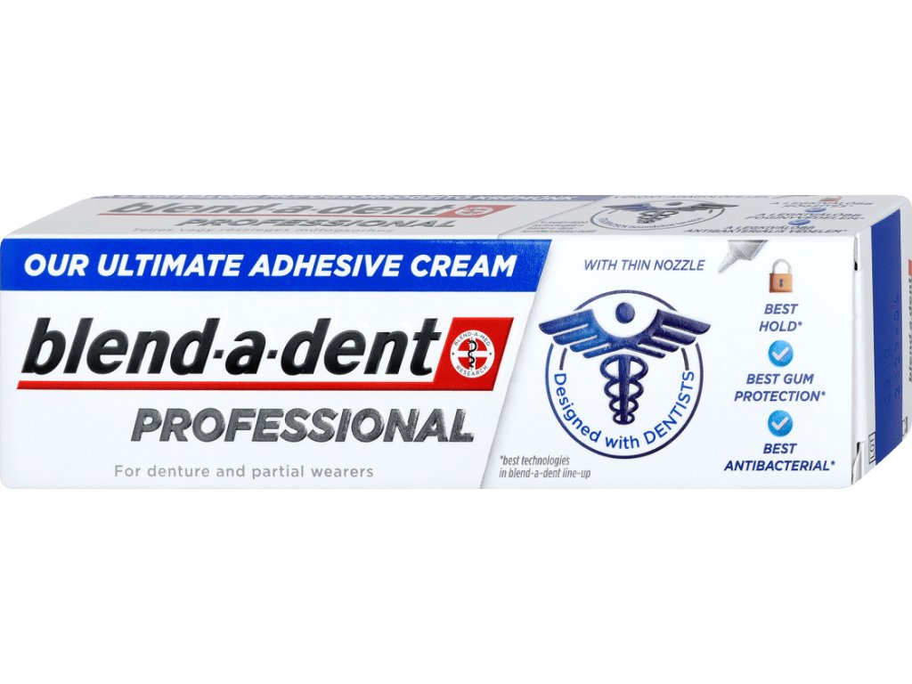Blend-a-dent Professional ist die stärkste Fixiercreme im Blend-a-dent-Sortiment. Sie begrenzt die Bewegung und Reibung der Prothese und sorgt für eine stärkere Verbindung zwischen Prothese und Zahnfleisch im Vergleich zu Blend-a-dent Original.