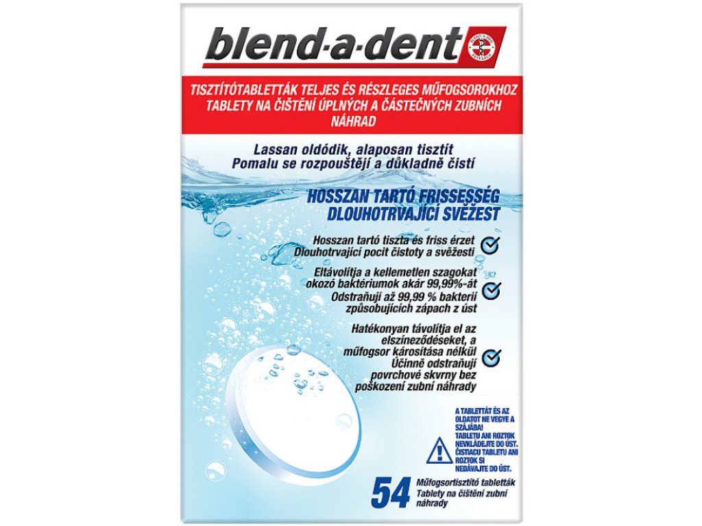 Beschreibung Blend-a-Dent Freshness Reinigungstabletten 54 Stück Blend-A-Dent Long Lasting Freshness Zahnprothesen-Reinigungstabletten entfernen effektiv Flecken und beschädigen die Zahnprothese nicht. Sie entfernen bis zu 99,99 % der geruchsbildenden Bakterien .