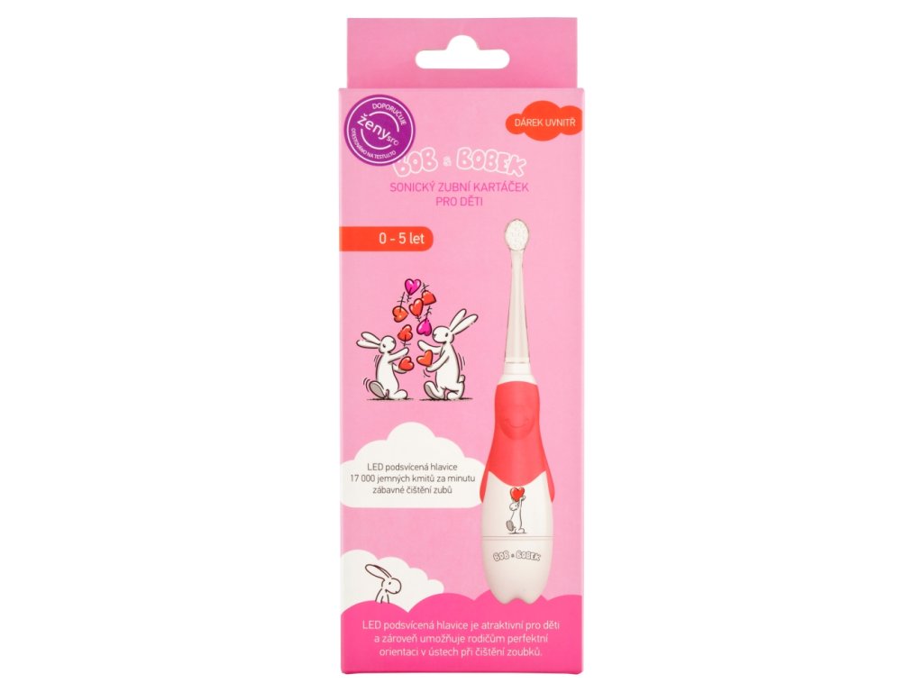 Die elektrische Schallzahnbürste Bob & Bobek Baby Pink für Kinder reinigt die Zähne Ihres Kindes dank eines Putzprogramms mit bis zu 17.000 Bewegungen pro Minute perfekt; ihre feinen Borsten schonen zudem empfindliches Zahnfleisch. Der wasserdichte Griff verhindert ein Ausrutschen des Kindes und verfügt über einen Timer für eine optimale Putzdauer. Im Lieferumfang sind zwei Ersatzbürstenköpfe enthalten.