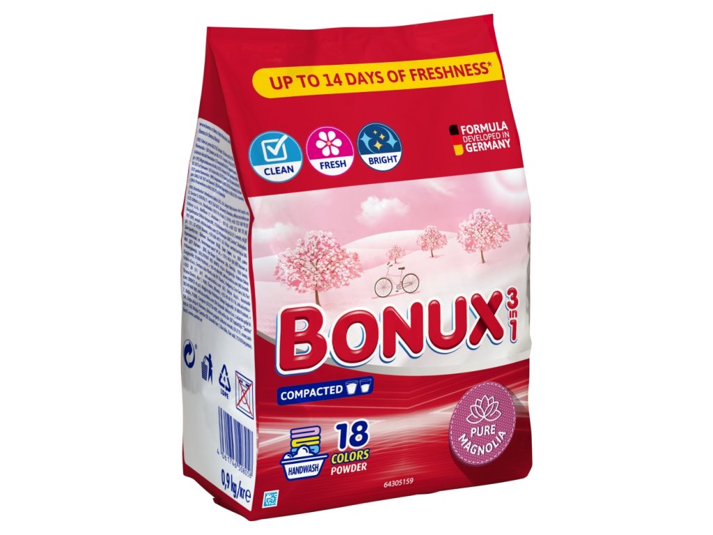 Bonux Color Pure Magnolia 3-in-1 Waschpulver enthält neue Aktivstoffe für besseres Waschen, Fleckenentfernung und einen Inhaltsstoff, der Kalkablagerungen vorbeugt. Es hinterlässt einen sanften und frischen, langanhaltenden Magnolienduft, der Ihre Kleidung parfümiert. Waschbar ab 20 °C. Nicht geeignet für Wolle und Seide.