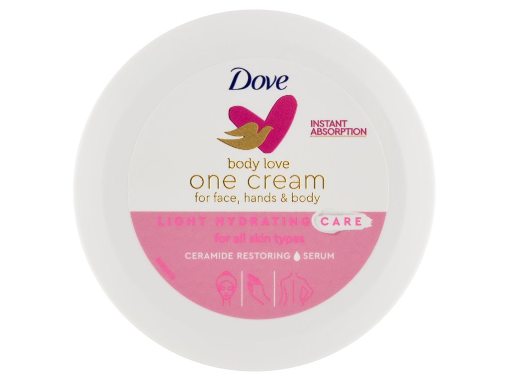 Dove Body Love One Cream ist eine leichte Feuchtigkeitscreme für alle Hauttypen. Sie bietet erstklassige Pflege, macht die Haut intensiv geschmeidig, hält sie weich und verbessert ihre Festigkeit. Schenken Sie Ihrer Haut Gesundheit mit der Dove One Cream Körpercreme. Die Creme ist für Gesicht, Hände und Körper geeignet.