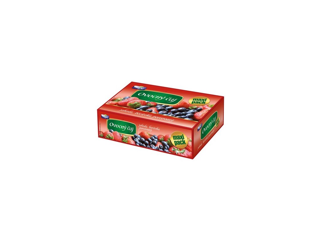Aromatisierter Früchtetee – Erdbeer-, Blaubeergeschmack, portioniert in Aufgussbeuteln.