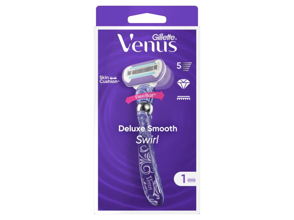 Der Gillette Venus Swirl Perfect Razor verfügt über die einzigartige FlexiBall-Technologie. Der Rasierkopf ist auf einer beweglichen Kugel montiert , was ihm unglaubliche Beweglichkeit und Anpassungsfähigkeit an die Hautkonturen verleiht, selbst an Knien oder Knöcheln. Unter den fünf scharfen, aber weichen Klingen befindet sich ein Kamm, der die Haare in die richtige Richtung führt und so für eine perfekte Rasur sorgt. Venus Swirl enthält außerdem das wasseraktivierte MoistureGlide Serum für sanfteres Gleiten und eine fünfmal bessere Feuchtigkeitspflege als der Original-Venus-Rasierer.