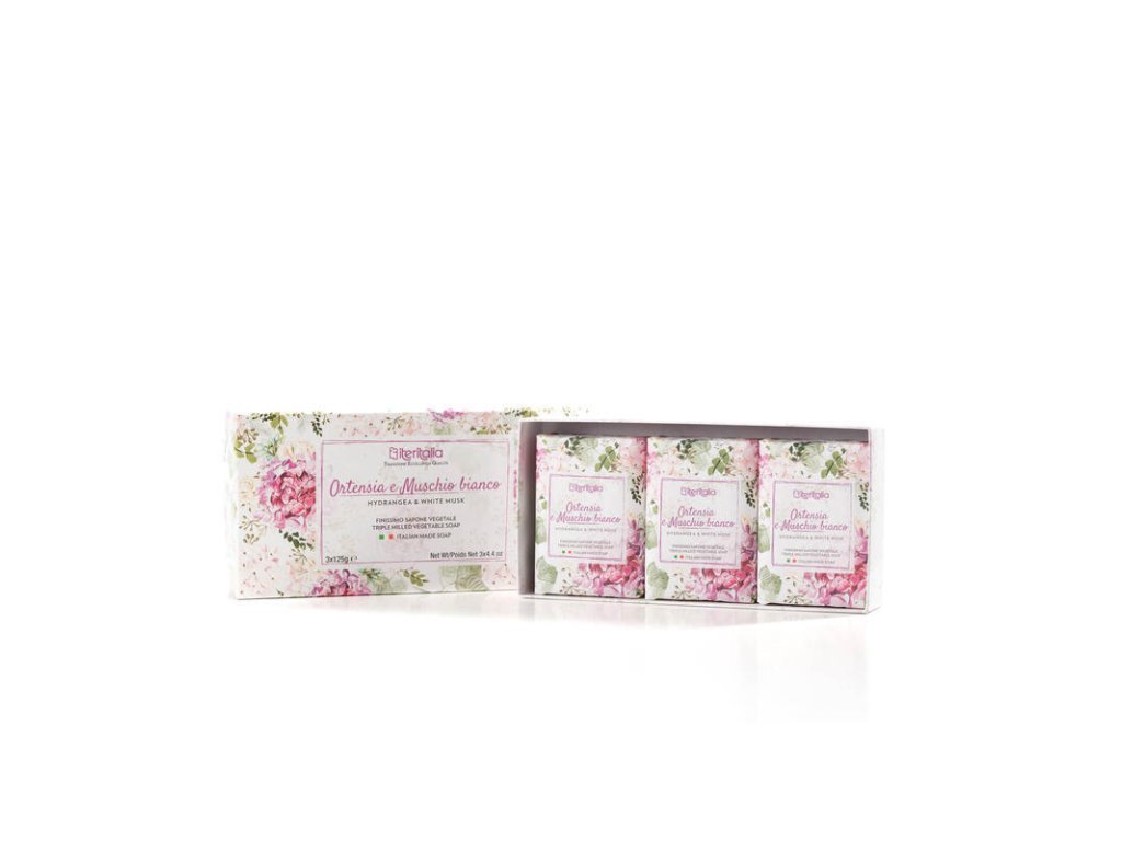 IRITALIA Kräuterseife Geschenkset - Hortensie und Weißes Moos, 3x125 g