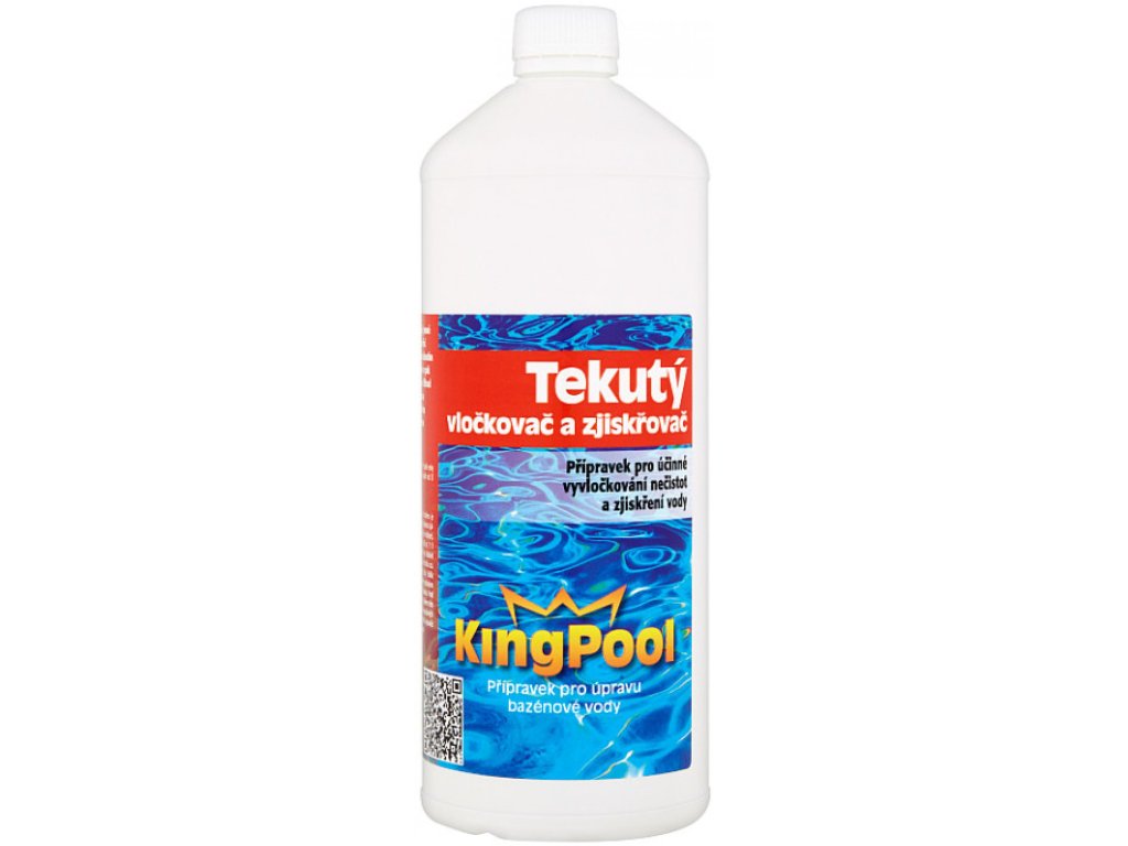 KingPool Flockungs- und Klärflüssigkeit - 1-l-Flasche. Flüssiges Produkt zum Flockulieren von Schmutz und Klären des Poolwassers. Das Produkt flockt feine Schmutzpartikel aus, die Wassertrübungen verursachen. Durch ihre Verklumpung bilden sich Flocken, die dann leicht im Filter aufgefangen werden oder auf den Boden des Pools sinken, wo sie mit einem Poolsauger abgesaugt werden können.