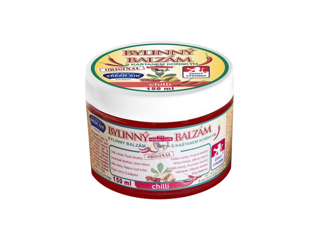 Kräuterbalsam mit sehr ausgeprägter wärmender Wirkung und erhöhtem Gehalt an Chiliextrakt und Rosskastanie. Gel hergestellt nach bewährter Originalrezeptur mit hohem Anteil an Pflanzenextrakten. Anwendung: Auf der Haut zur Linderung von Anstrengungen, Müdigkeit nach langem Stehen, zur vorbeugenden Erwärmung von Muskeln und Gelenken. Geeignet zur Beruhigung und Regeneration. Der Balsam enthält außerdem Kräuterextrakt aus Rosskastanie, der auf Schwellungen wirkt, Beinwell, der die Zellerneuerung beschleunigt, Berg-Arnika, die Prellungen lindert, Rosmarin, der Müdigkeit lindert, und andere auf dem Etikett aufgeführte wohltuende Kräuter. Inhaltsstoffe: Aqua, Glycerin, Alkohol, Paraffinum Liquidum Triethanolamin, Carbomer, PEG-40 hydriertes Rizinusöl, Natriumsulfat, Propylenglykol, Benzylalkohol, Aesculus Hippocastanum Samenextrakt, Glycol PPG-2 Methylether, MEK, 2-Brom-2-Nitroproban-1,3-Did, Capsium, Helianthus Annus Samenöl, Eukalyptus Globulus Blattöl, Lodopropylbutylcarbamat, Trideceth-9, Natriumchlorid, Rosmarinus Blattextrakt, Eupatoria Extrakt, Arnica Montana Blütenextrakt, Calendula Officinalis Blütenextrakt, Caluna Vulgaris Extrakt, Chamomilla Recutita Blütenextrakt, Ginkgo Bloba Blattextrakt, Juniperus Communis Fruchtextrakt, Lavandula Angustifolia Blütenextrakt, Polygonum Bistoria Wurzelextrakt, Ribes Nigrum Blattextrakt, Scutelaria Extrakt, Thymus Vulgaris Extrakt, Kalium Sorbat, Methylnicofinat, Sympium Officnale Wurzelextrakt, Phenoxyethanol, Limonen, Linalool, CI 17200. Herstellungsdatum und Mindesthaltbarkeitsdatum: auf der Verpackung angegeben. Kühl und trocken lagern. Vor direkter Sonneneinstrahlung schützen. Importeur: Putorius sro, Ruzyňská 18, Prag, Tschechische Republik