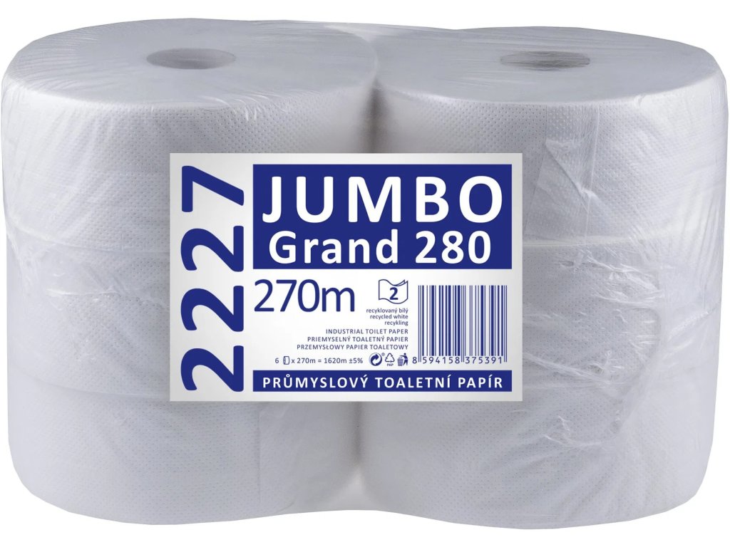 Industrie-Toilettenpapier JUMBO Grand 280, 2-lagig, weiß recycelt – 6 Stück/Packung.