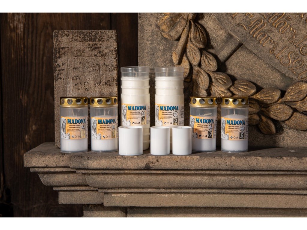 Weiße Madonna-Kerzen, geeignet für Friedhöfe. Brenndauer bis zu 15 Stunden. Packungsinhalt: 4 Stück.Zusätzliche Parameter