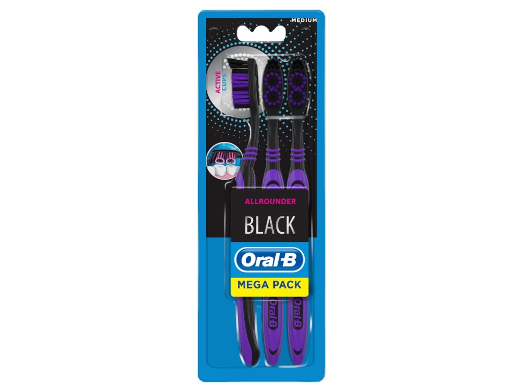 Eine mittelharte Zahnbürste mit kreisförmigen Borsten für eine bessere Reinigung zwischen den Zähnen und entlang des Zahnfleischrandes. Ihre abgerundeten Enden sind sanft zum Zahnfleisch.