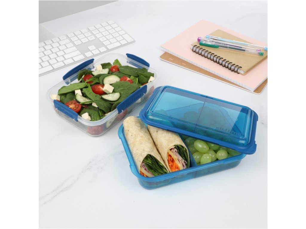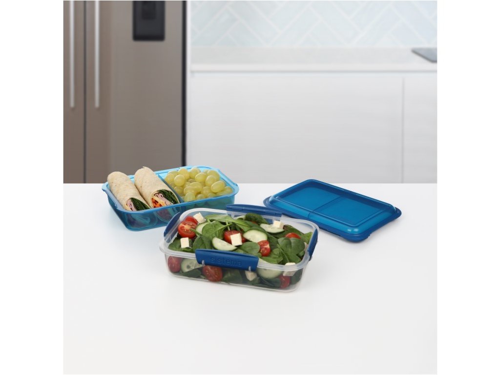 Eine Snackbox mit praktischer Inneneinteilung. Die Box besteht aus zwei Teilen (Unterteil und Deckel), wobei ein Teil durch eine feste Trennwand in zwei Hälften unterteilt ist. Unterteil und Deckel sind durch eine herausnehmbare Trennwand voneinander getrennt, die als Tablett oder Teller verwendet werden kann. Die Trennwand ist umlaufend versiegelt und schützt so zuverlässig Unter- und Deckel der Box. Nach dem Verzehr kann der farbige Deckel in das Unterteil eingesetzt und mit den Sistema-Schnappverschlüssen fixiert werden. Das spart Platz im Rucksack oder in der Tasche. Vorteile: • Zwei Fächer zur Trennung von Lebensmitteln • Der Deckel kann nach dem Verzehr in das Unterteil eingesetzt werden • Stapelbar • Robustes PlastikZusätzliche Parameter