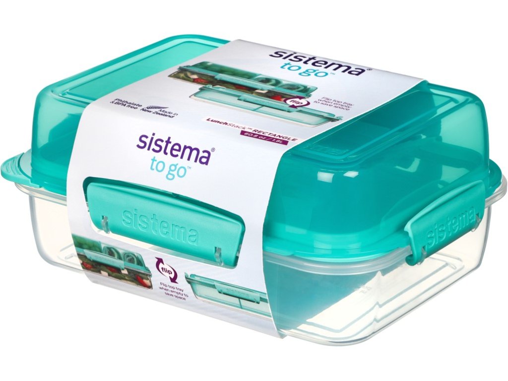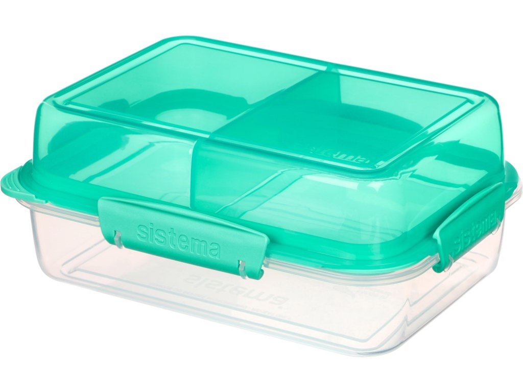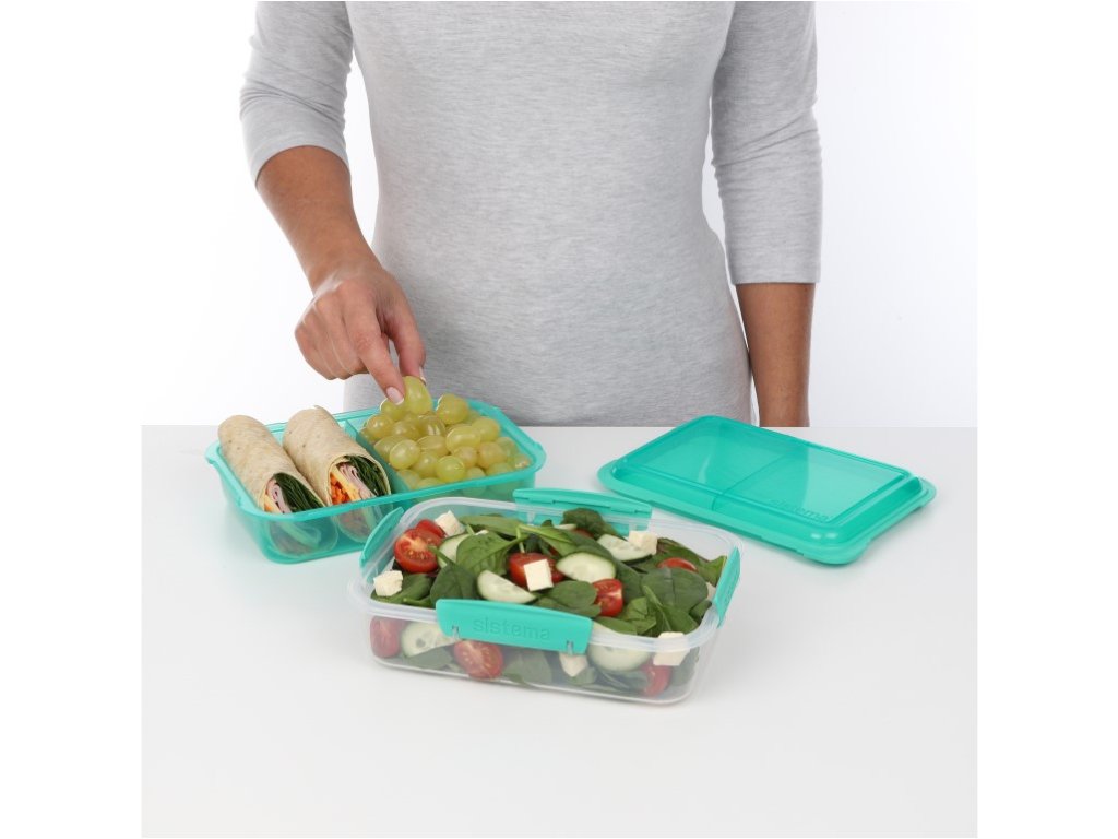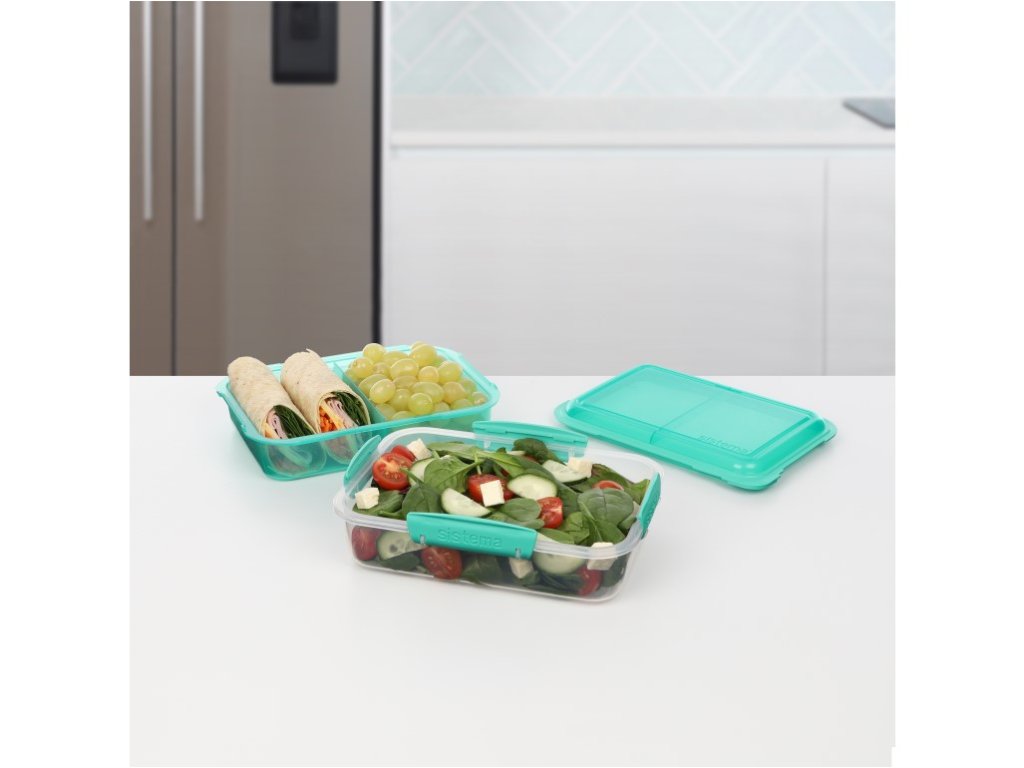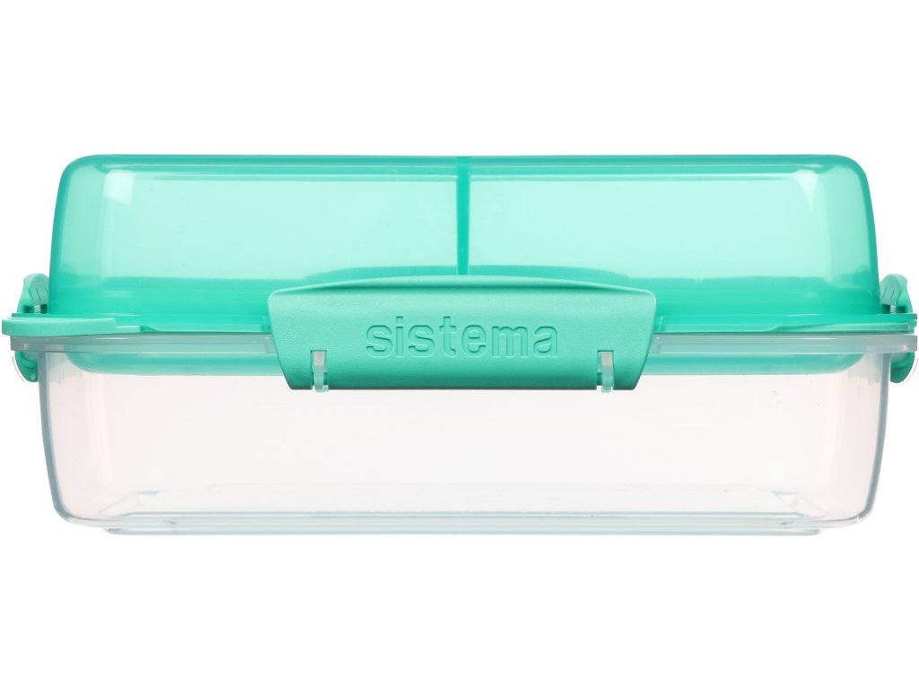 Eine Snackbox mit praktischer Inneneinteilung. Die Box besteht aus zwei Teilen (Unterteil und Deckel), wobei ein Teil durch eine feste Trennwand in zwei Hälften unterteilt ist. Unterteil und Deckel sind durch eine herausnehmbare Trennwand voneinander getrennt, die als Tablett oder Teller verwendet werden kann. Die Trennwand ist umlaufend versiegelt und schützt so zuverlässig Unter- und Deckel der Box. Nach dem Verzehr kann der farbige Deckel in das Unterteil eingesetzt und mit den Sistema-Schnappverschlüssen fixiert werden. Das spart Platz im Rucksack oder in der Tasche. Vorteile: • Zwei Fächer zur Trennung von Lebensmitteln • Der Deckel kann nach dem Verzehr in das Unterteil eingesetzt werden • Stapelbar • Robustes PlastikZusätzliche Parameter