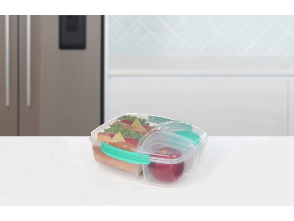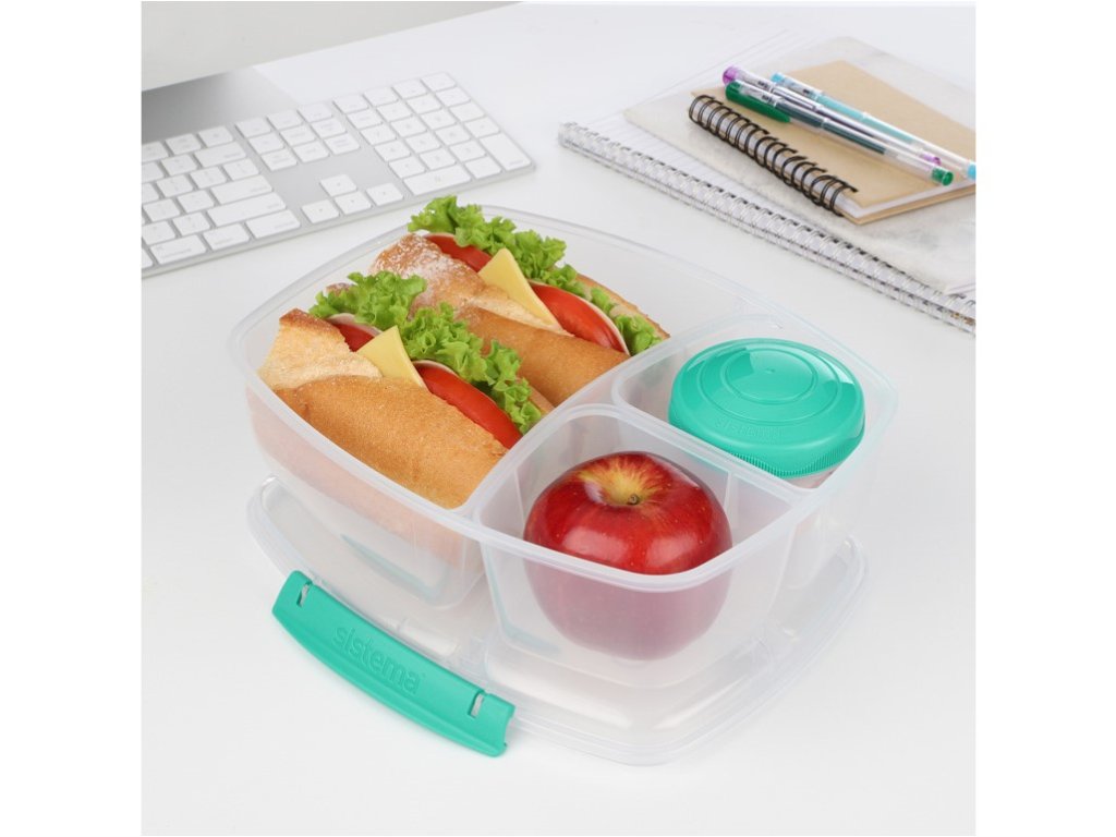 Diese Box hilft Ihnen, Plastiktüten und Frischhaltefolie zu reduzieren und gleichzeitig Ihre Lebensmittel frisch und lecker zu halten. Sie ist in drei Fächer unterteilt, sodass Sie verschiedene Lebensmittel transportieren können, ohne dass diese sich vermischen. Vorteile: 3 Fächer (1 großes und 2 kleine), Joghurtbehälter (150 ml), einfacher Verschluss: Sistema®-ClipZusätzliche Parameter
