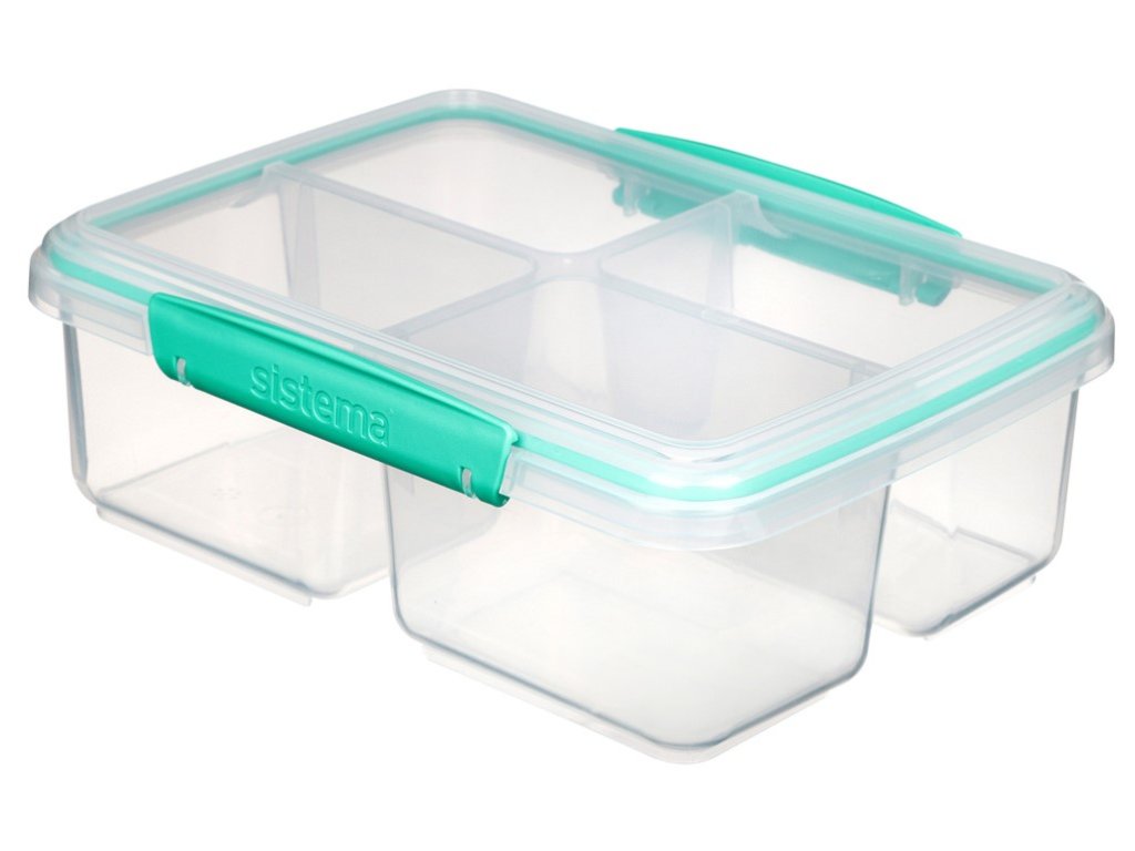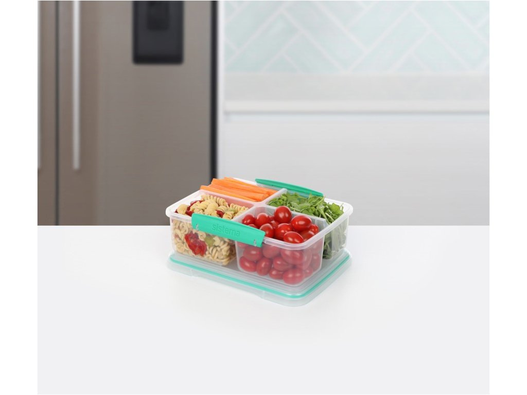 Die Box ist in vier Fächer unterteilt, sodass Sie verschiedene Lebensmittel getrennt aufbewahren und vor Vermischung schützen können. So können Sie beispielsweise Salat, Obst, Nüsse und Kekse in einer Box mitnehmen. Mit dieser Box reduzieren Sie den Verbrauch von Plastiktüten und Frischhaltefolie und sorgen gleichzeitig dafür, dass Ihre Lebensmittel frisch und lecker bleiben. Vorteile: • 4 Fächer • Einfacher Verschluss: Sistema®-Clip und elastische Dichtung • Geräumig und praktischZusätzliche Parameter