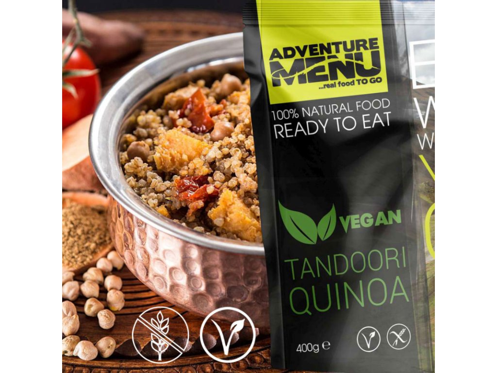 Tandoori Quinoa ist ein exotischer Snack in Form einer Fertigmahlzeit mit Süßkartoffeln, Quinoa, einer Mischung aus saftigem Gemüse, Gewürzen und Chili. Es ist die ideale Wahl für Aktivurlauber, die auf langen Wanderungen Wert auf hochwertiges Essen legen. Auch Campingfans, die nicht nur Fast Food essen möchten, werden es zu schätzen wissen. Die Zubereitung ist dank der beiliegenden Anleitung schnell und einfach . Tandoori Quinoa begeistert nicht nur Veganer, sondern auch Fleischliebhaber. Es eröffnet ihnen eine neue Geschmacksdimension .