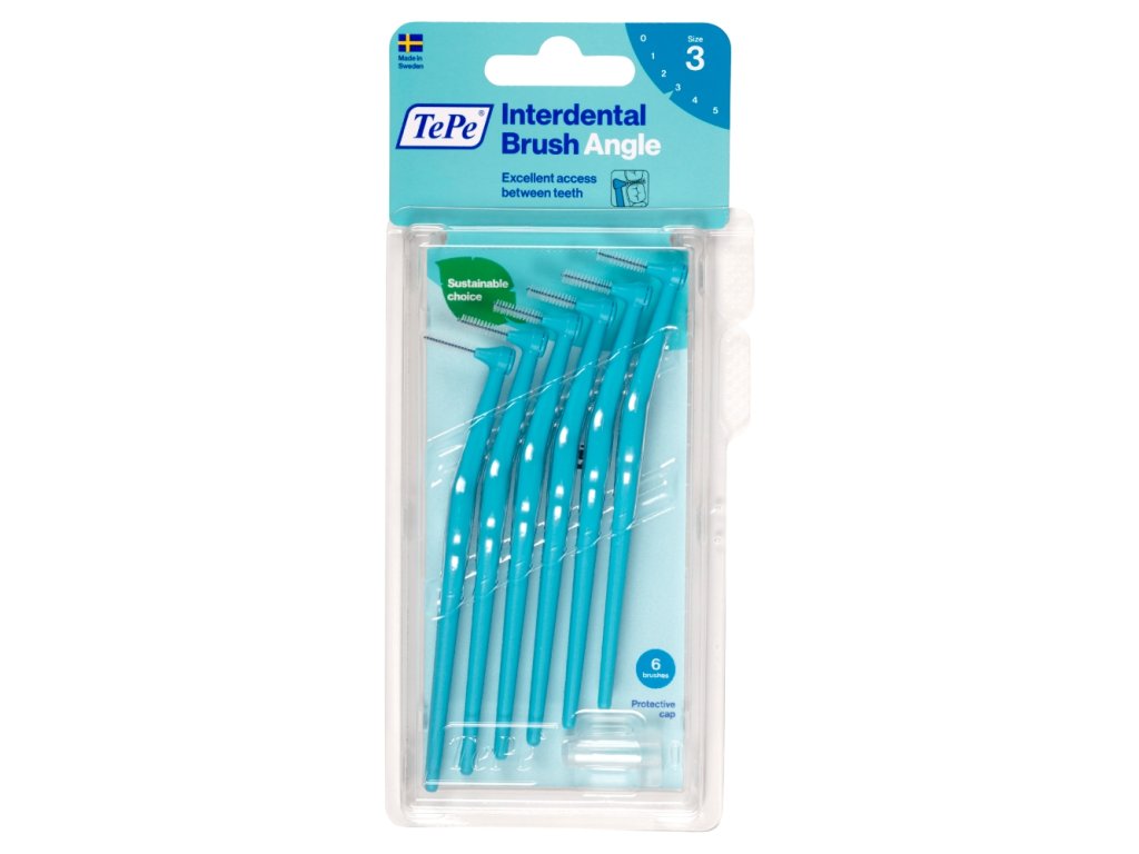 Tepe Angle, eine Interdentalbürste, entwickelt für den perfekten Zugang zu den Zahnzwischenräumen. Der schlanke, rechtwinklig abgewinkelte Reinigungskopf ermöglicht einen einfachen Zugang, insbesondere zu den hinteren Zahnzwischenräumen von Gaumen und Zunge. Tepe Angle ist einfach zu handhaben, der lange, flache Griff ermöglicht einen natürlichen, ergonomischen Griff und unterstützt kontrollierte und sichere Bewegungen. Alle Größen verfügen über einen pastenbeschichteten Draht für eine sanfte Reinigung.