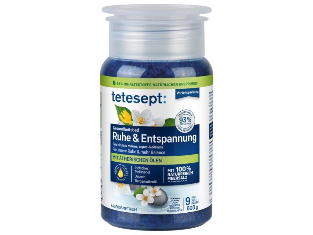 Meersalz fürs Bad Tetesept Badesalz Beruhigung und Entspannung ist ein besonderer Meersalz-Badezusatz, der die Entspannung von Körper und Geist fördert. Die einzigartige Kombination natürlicher ätherischer Öle wirkt in Verbindung mit warmem Wasser beruhigend. Enthält Jasminextrakt und Öle aus Zitronenmelisse, Bergamotte, Ylang-Ylang, Lavendel und Orange. Die einzigartige Komposition mit hochwertigen ätherischen Ölen ist speziell darauf ausgelegt, körperliche und seelische Anspannungen zu lösen. Die ätherischen Öle entfalten in Verbindung mit warmem Wasser ihre Wirkung und sorgen für Entspannung. Zusätzlich hinterlässt das natürliche und pflegende Meersalz die Haut gereinigt und gepflegt. Unser Qualitätsversprechen: 98 % Inhaltsstoffe natürlichen Ursprungs Hautverträglichkeit dermatologisch bestätigt Mikroplastikfreie Zusammensetzung Veganes Produkt Dose aus 100 % recycelbarem Material (ohne Deckel und Etikett) Anwendung: Füllen Sie ¾ des Deckels mit Tetesept Meersalz und geben Sie es in die Badewanne. Genießen Sie ein 10-20-minütiges Bad bei 35-38 °C. Spülen Sie die Wanne nach dem Baden mit warmem Wasser aus. Warnhinweis: Nicht für Kinder geeignet. Auf gesunder Haut anwenden. Außerhalb der Reichweite von Kindern aufbewahren. Nicht während der Schwangerschaft und Stillzeit anwenden. Kontakt mit empfindlichen Körperstellen vermeiden.