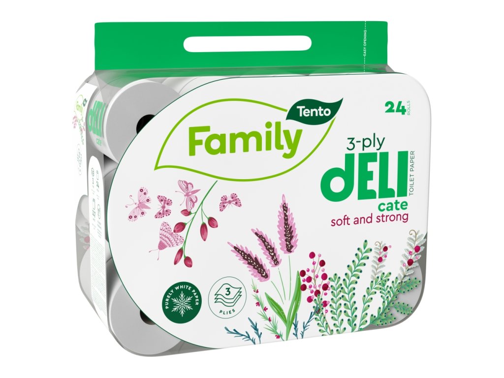 Toilettenpapier. Es ist für jedes Zuhause oder Büro geeignet. Es besteht aus drei Lagen, wodurch es stark ist und nicht in Ihren Händen zerfällt. Family Delicate ist ein hochwertiges, weiches und starkes Toilettenpapier. Seine perfekte Weiße und das elegante Design verleihen Ihrem Badezimmer eine sanfte Eleganz. Dank des angenehmen Materials garantiert dieses Toilettenpapier echten Komfort. Es ist ein dreilagiges Papier, das gleichzeitig Stärke und Weichheit garantiert. Es ist die ideale Wahl, wenn Sie klassisches Toilettenpapier ohne Parfüm kaufen möchten. Der große Vorteil des gewählten Materials ist, dass es Ihrer Haut maximalen Schutz und Sanftheit bietet. In einer riesigen XXL-Verpackung finden Sie insgesamt 24 Rollen. Wichtige Vorteile des Toilettenpapiers TENTO Family deLI (32 Stück) Garantiert Bequemlichkeit und Komfort dank maximaler Weichheit und Festigkeit Das Toilettenpapier TENTO Family deLI (24 Stück) ist nicht parfümiert, also frei von Duftstoffen Als dreilagiges Papier ist es weich und sehr langlebig Es ist ein Produkt aus 100 % Zellulose In einer Packung TENTO Toilettenpapier erhalten Sie 32 Rollen Es ist sanft auch zu sehr empfindlicher Haut