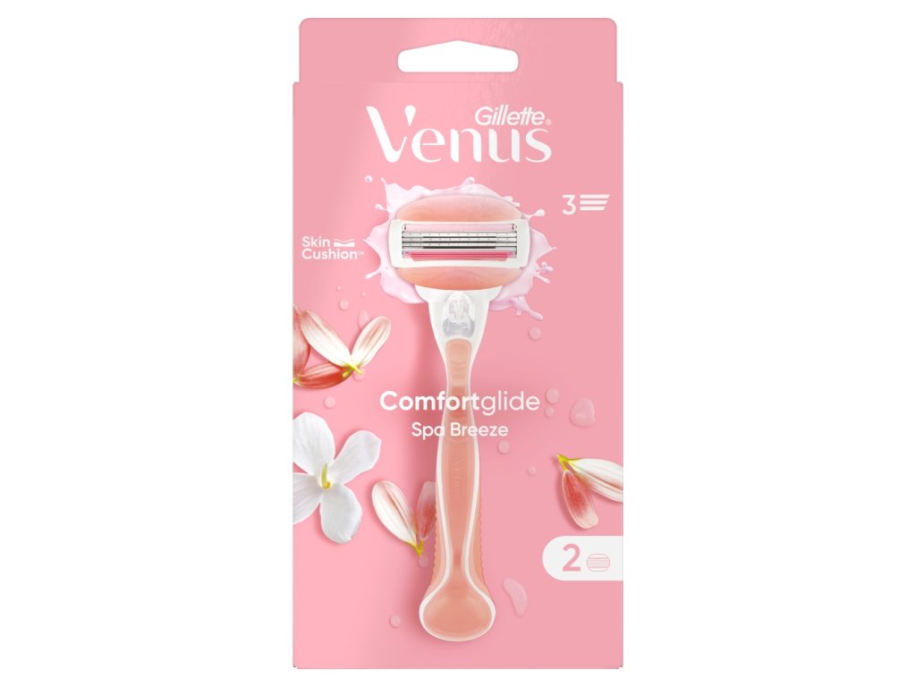 Verwöhnen Sie Ihre Haut mit dem ComfortGlide Spa Breeze Damenrasierer mit weißem Teeduft. Flexible Feuchtigkeitsstreifen geben leichte Körperbutter ab, die dem Rasierer ein sanftes Gleiten über die Haut ermöglichen.